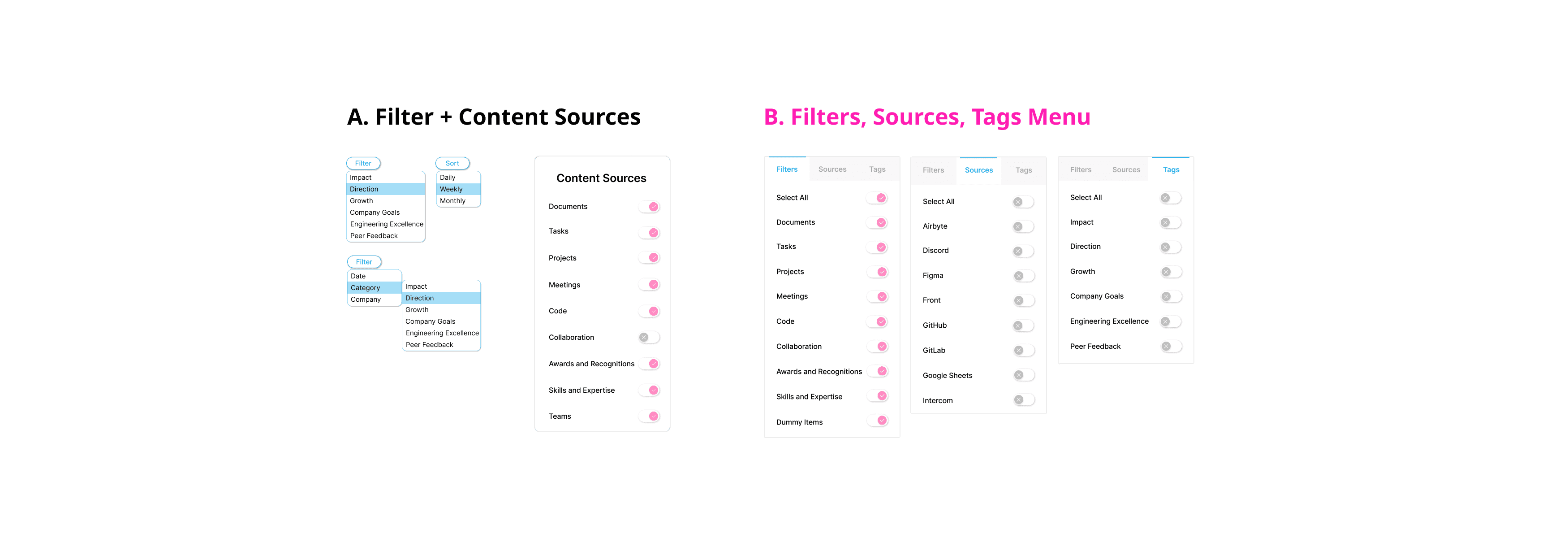 At the start, I separately designed a 'Filter' button and 'Content Sources' menu. Design A shows two 'Filter' button designs and a 'Content Sources' menu design. Throughout the iteration process, I chose to go with a more condensed option, Design B, which is a menu combining filters, sources, and tags users can switch between and items to toggle on or off.