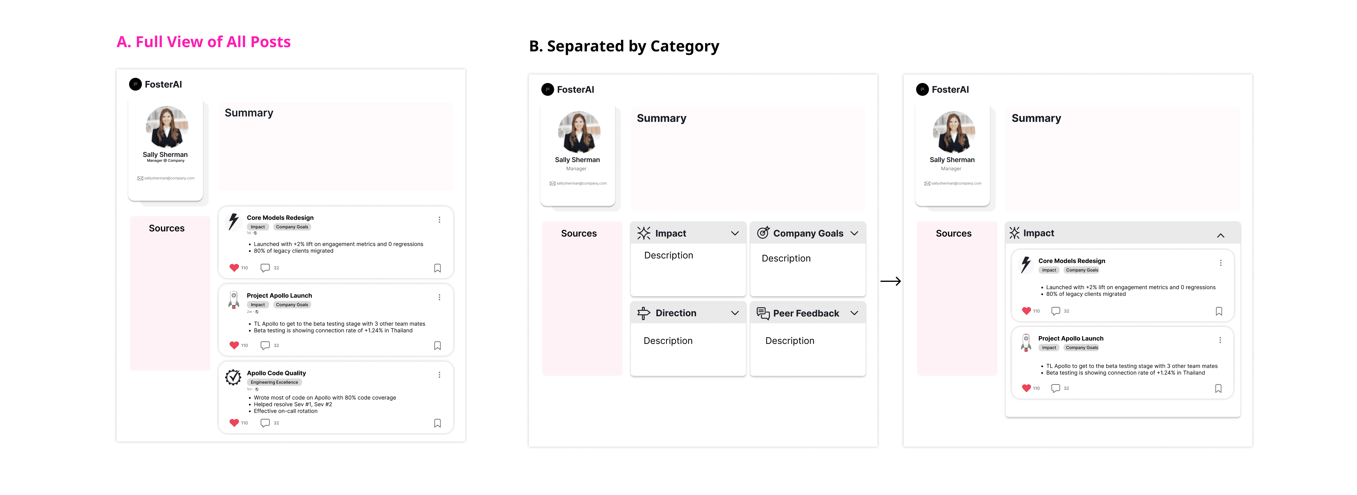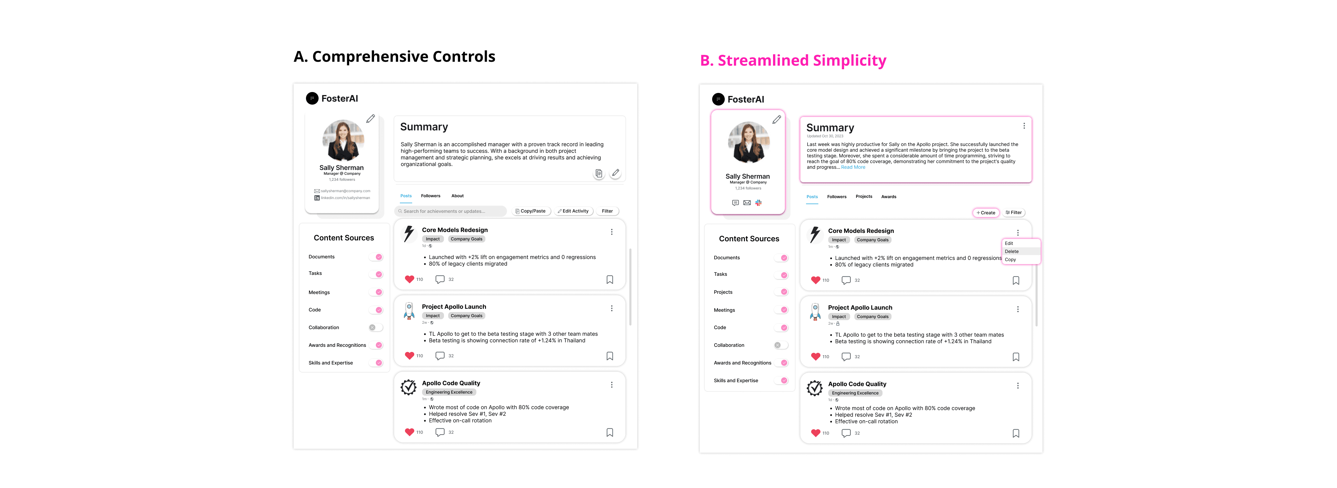 Starting off, I explored two structures for the activity feed. Both structures include the user’s profile, summary, achievements overview, and sources. Design A closely reflects the activity feed low-fi wireframe, listing out each achievement as a card stack. Design B groups the achievements into different categories, displaying each category as a card stack.