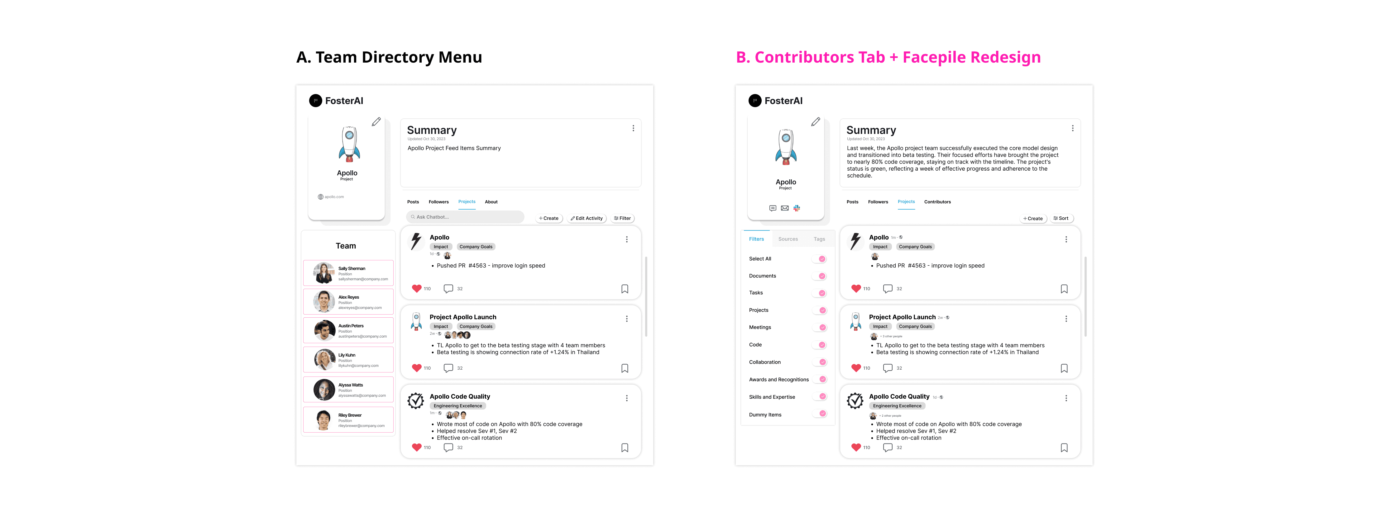 The team project activity feed follows the same layout as a user's personal activity feed for familiarity. Design A displays the team directory as a side bar menu. Design B includes the team directory to a 'Contributors' tab and a facepile with number variant. I chose to go with Design B form to keep activity feed design for project and personal similar and concise.