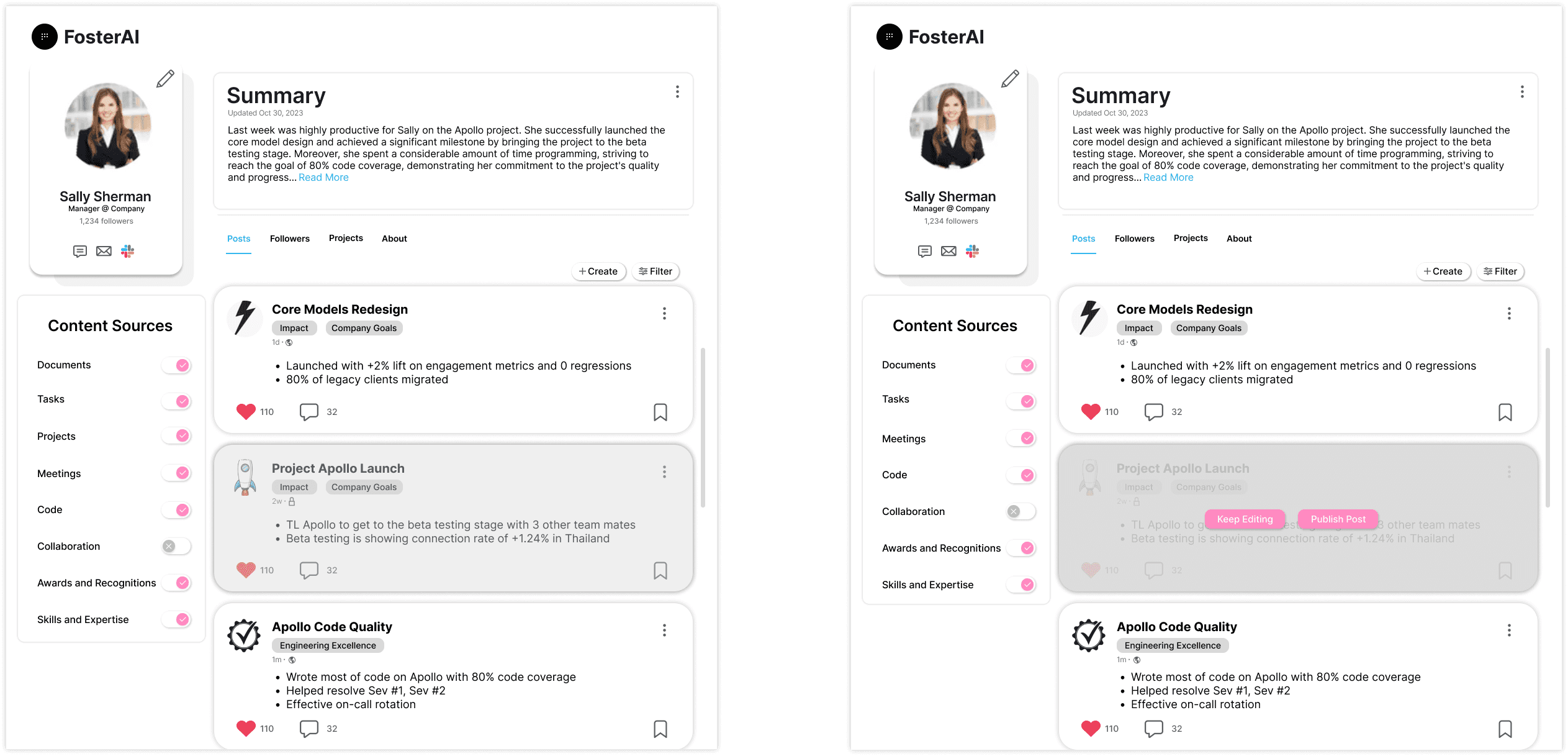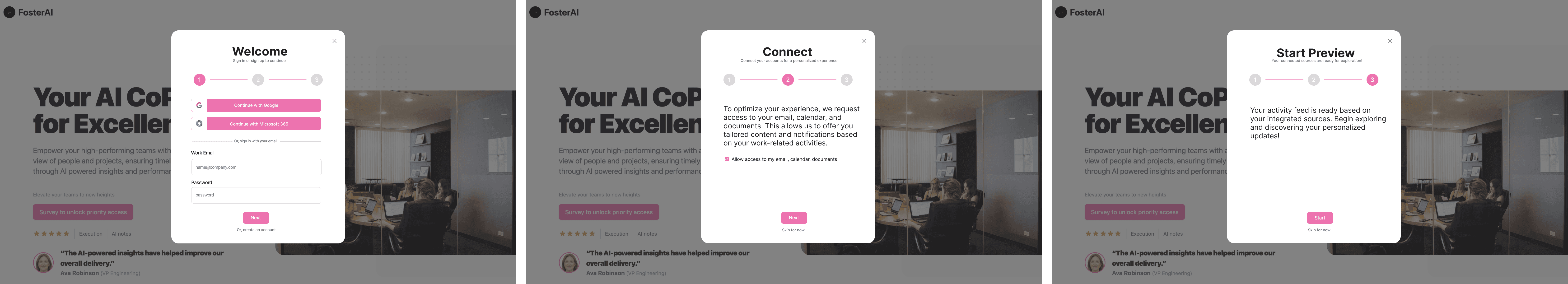 I created UI designs for FosterAI, a platform that helps high-performing teams stay aligned through AI-powered insights. My work focused on designing the user activity feed, team project dashboard, onboarding experience, and chatbot interface. These features were built to support transparency, timely feedback, and smoother collaboration. I prioritized clarity and usability across all workflows, and helped shape a cohesive user experience that reflects FosterAI’s mission of empowering teams through data-driven design.